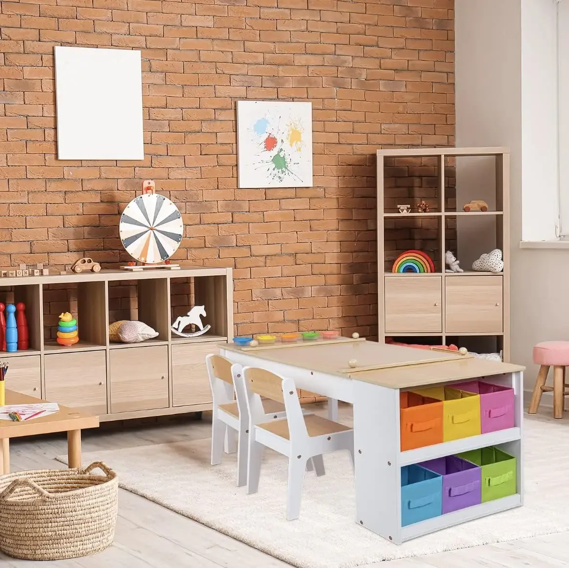 - Ready For Play: Our furniture set comes complete with 2 kid-sized chairs, 6 storage bins, and 5 paint/supply cups, so the fun can begin right away. Durable easel paper dispenser comes preloaded with a paper roll, too!
