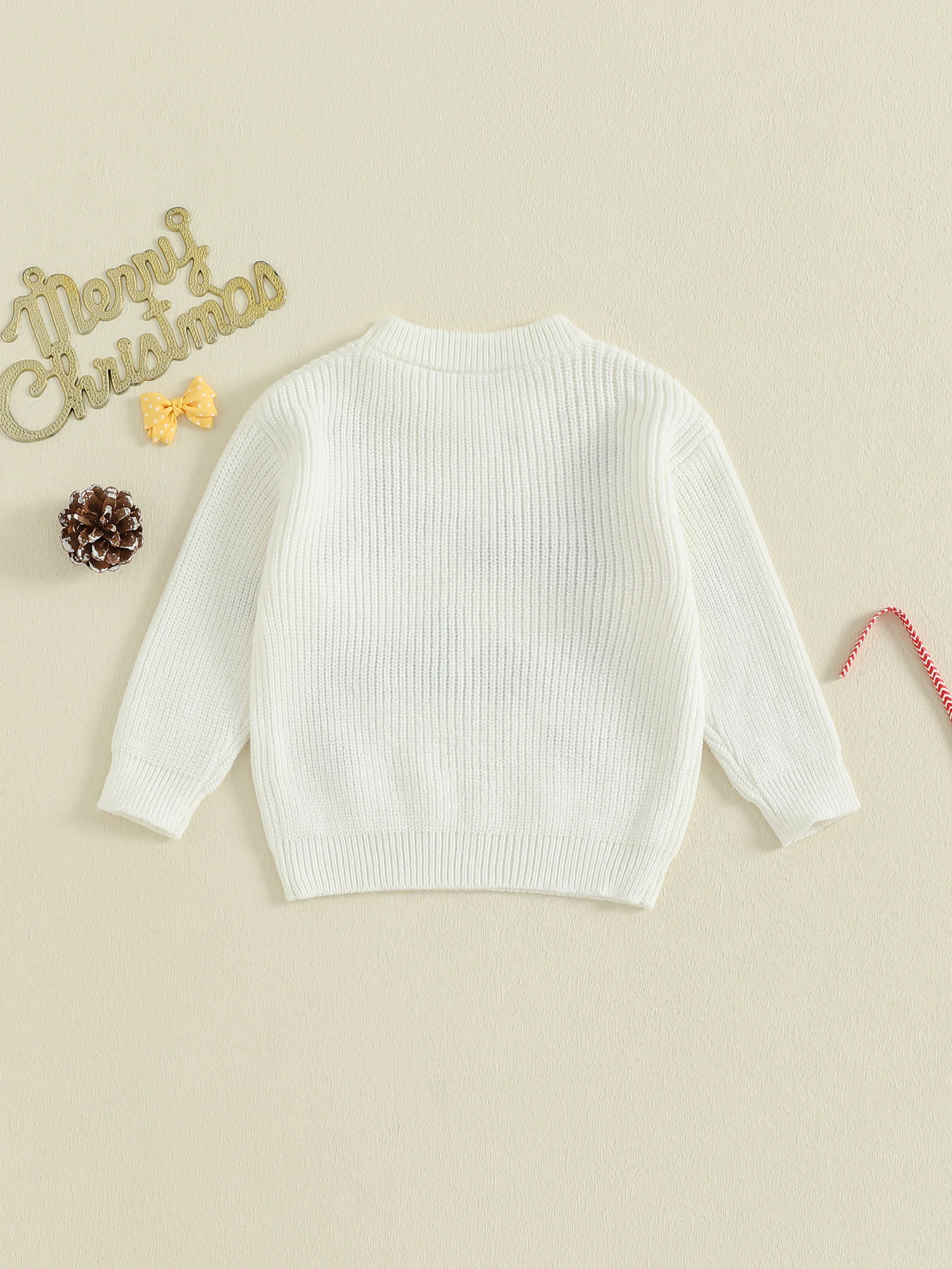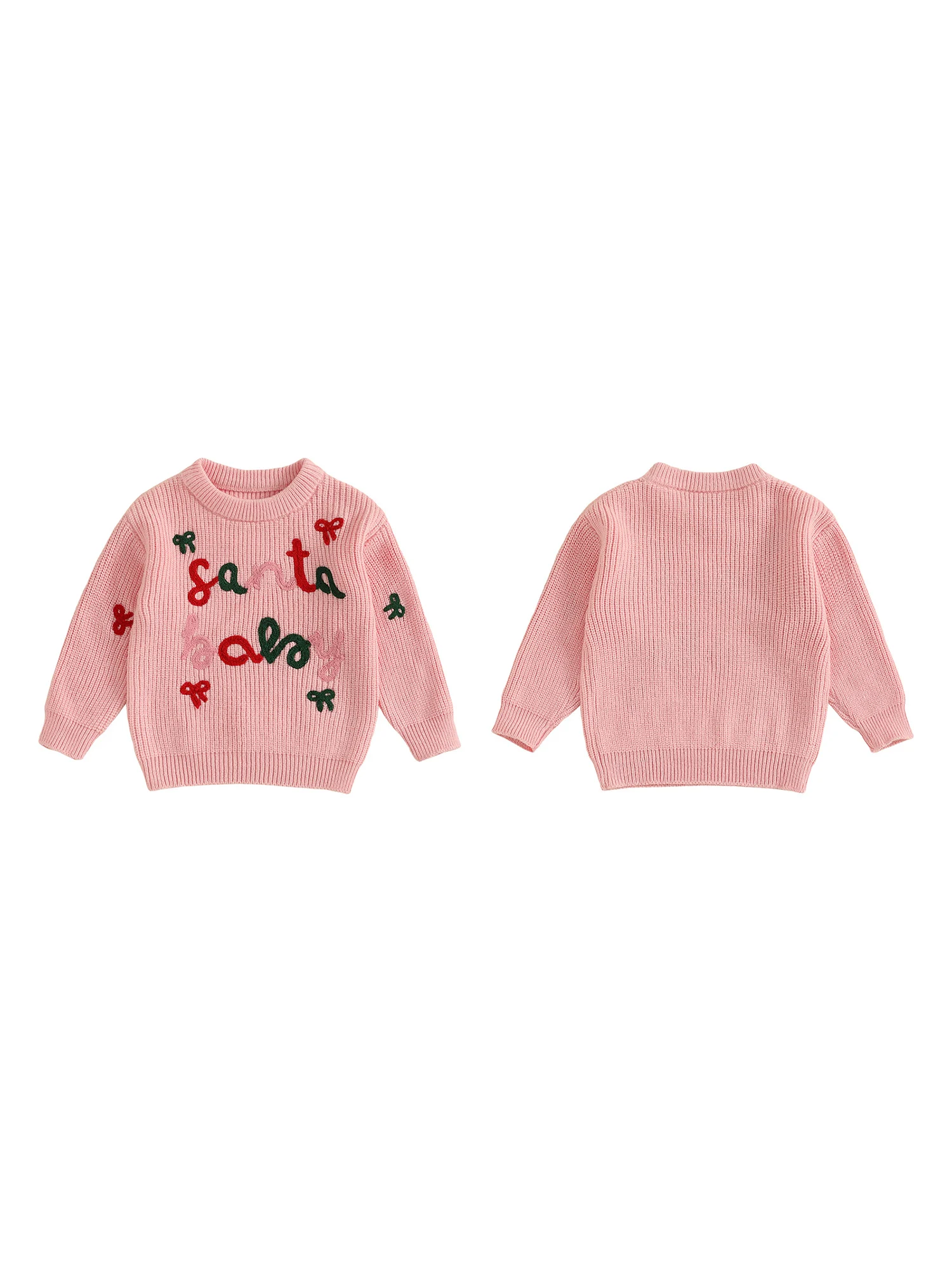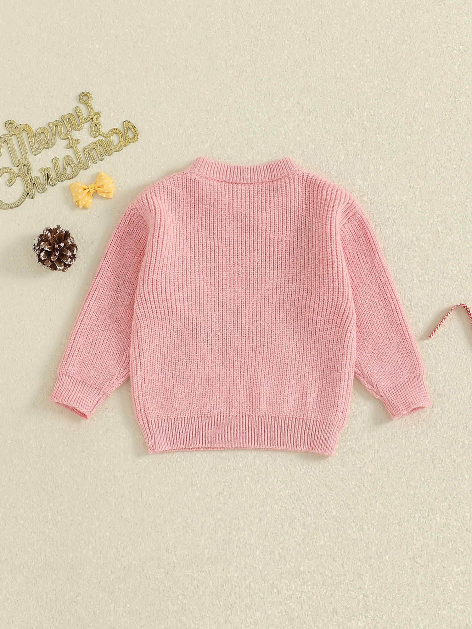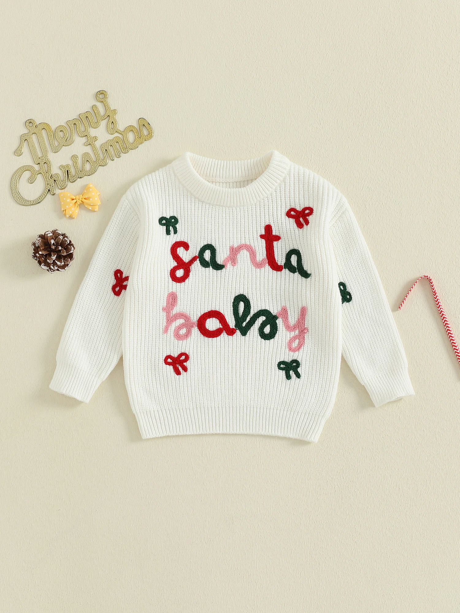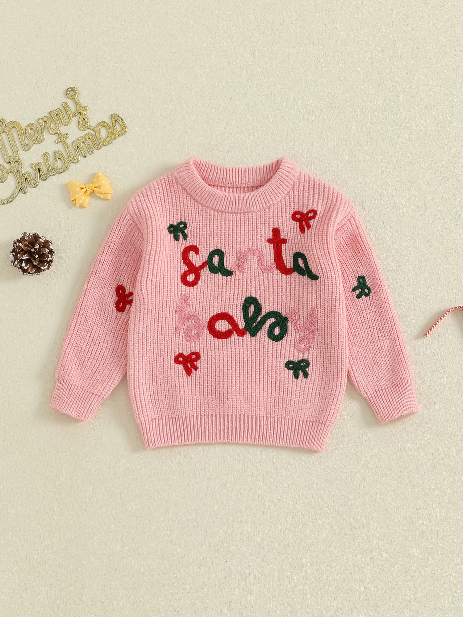 Cute Toddler Christmas Sweaters with Long Sleeves and Round Neckline Adorable Letter and Bow Embroidery Detail on Baby Girl