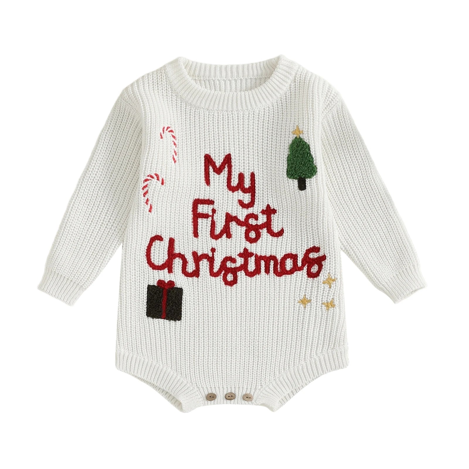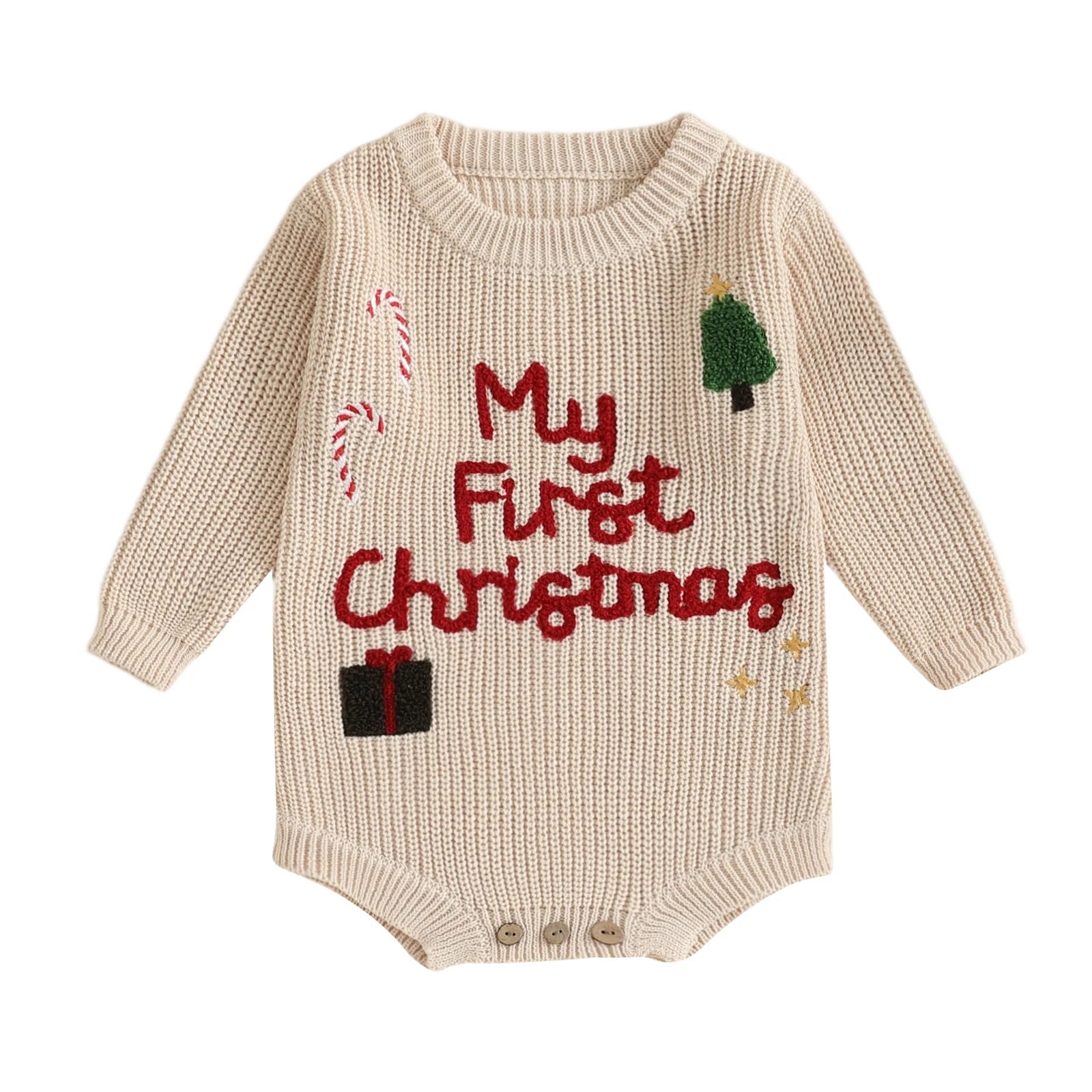 Baby Girl Christmas Sweater Romper Long Sleeve O Neck Letter Candy Cane Embroidery Jumpsuit