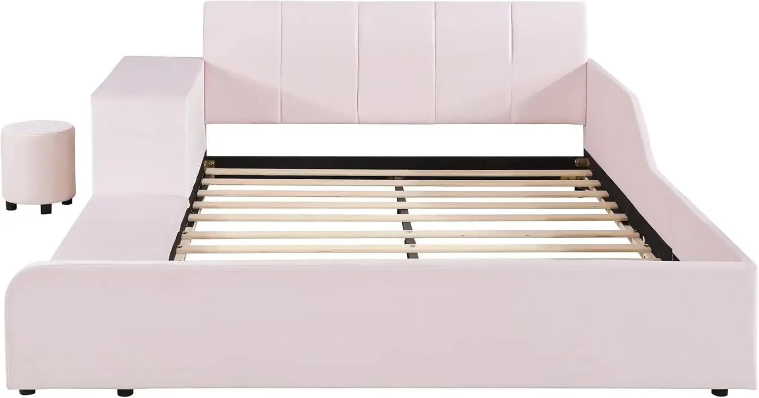 Velvet Upholstered Grounded Bed Platform Bed, Wooden Full Size Mother & Child Bed Frame with Bedside Desk and Little Round Stool